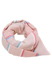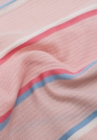 Personne portant une écharpe rayée rose sur une chemise à fines rayures bleu clair et un pantalon beige, les mains dans les poches.