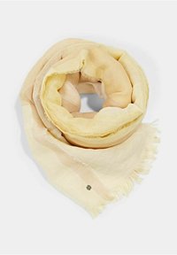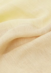 Écharpe légère jaune beige roulée avec bords effilochés et motif à carreaux subtil sur fond blanc.