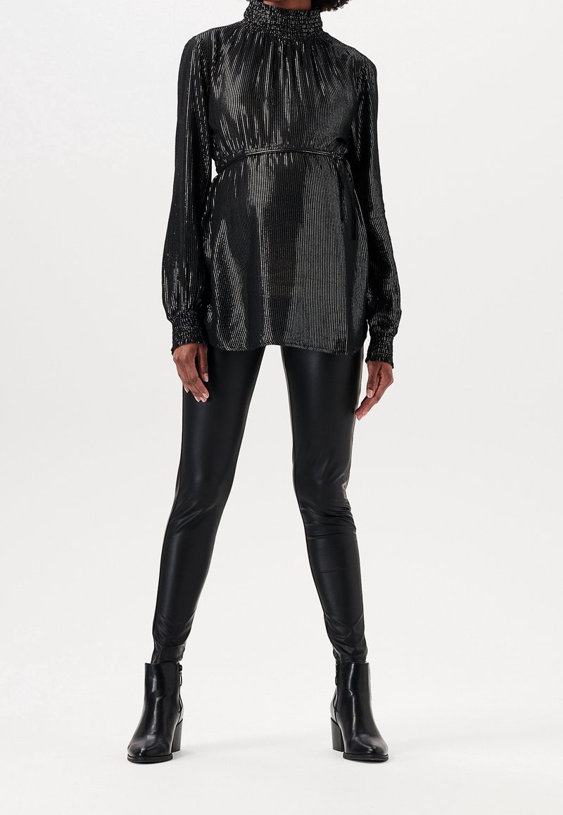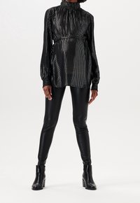 Personne portant un chemisier noir brillant à col haut avec des manches longues, des leggings en cuir noir et des bottines noires sur un fond blanc.