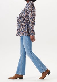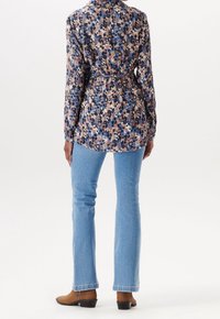 Chemise à boutons fleurie en bleu, rose et crème. Comprend une ceinture à la taille, des manches longues, un col et une coupe décontractée. Associée à un jean bleu clair et des bottines marron.