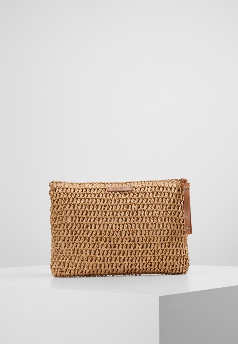 Pochette rectangulaire en paille tressée avec fermeture éclair et petite étiquette de marque en cuir, posée sur un socle blanc contre un fond uni.