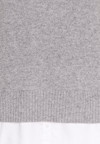 Pull en maille gris clair avec poignets et ourlet côtelés, superposé à une chemise blanche à col avec un col volanté.
