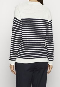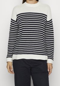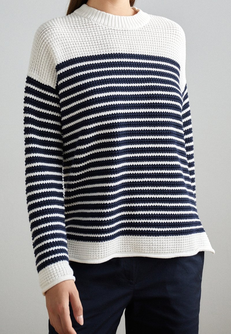 Pull en maille à rayures bleu marine et blanc, avec un col rond côtes et un tissu texturé. Manches longues avec poignets côtelés.