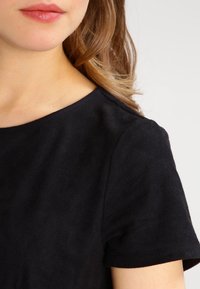 Robe noire à manches courtes en suède doux, avec un corsage ajusté et une jupe évasée. Présente des coutures minimales et un col rond.