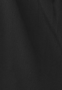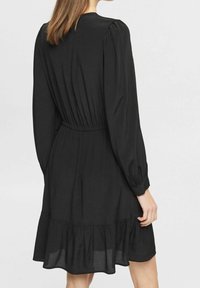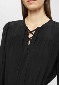 Robe noire avec manches longues bouffantes, encolure à lacets, taille froncée et ourlet évasé à volants. Tissu lisse avec une texture douce.