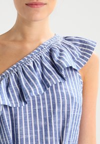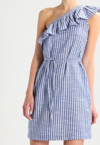 Robe à rayures bleues et blanches, à une épaule, avec un col à volants, une taille cintrée et une ceinture nouée. Confectionnée dans un tissu léger avec un design décontracté.