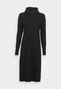 Robe en maille gris foncé à manches longues avec un col roulé haut. Présente une coupe décontractée et des poignets côtelés, adaptée à un usage décontracté.