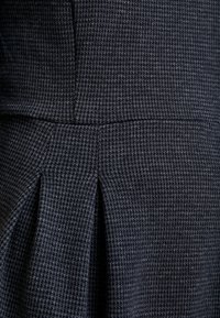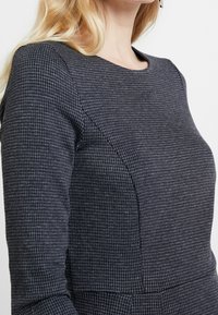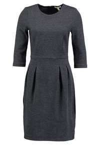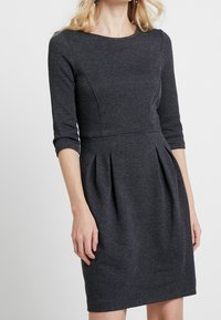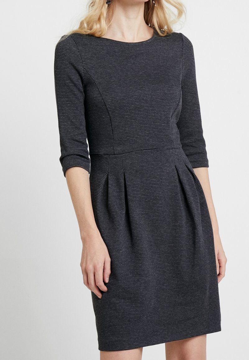 Robe à carreaux gris en tissu texturé, dotée de manches trois-quarts, d'un corsage ajusté et d'un jupon plissé.