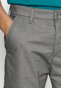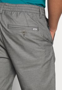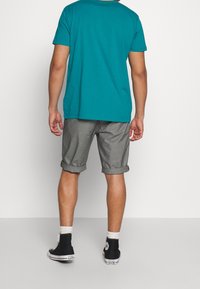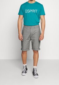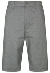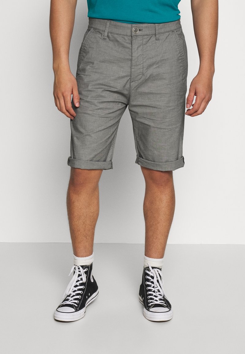 Shorts gris roulés avec poches latérales, en tissu léger. Portés avec des baskets montantes noires et des chaussettes blanches.