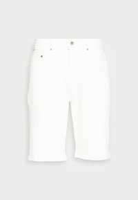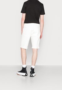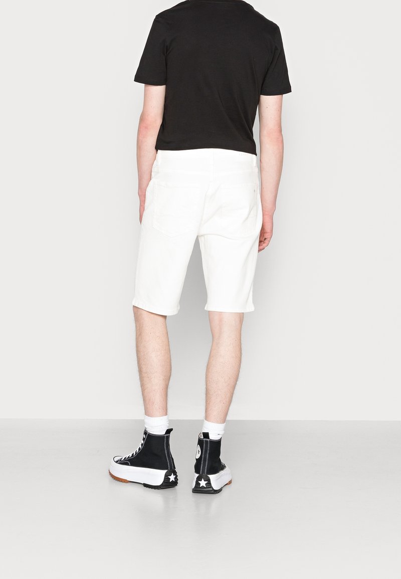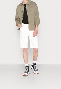 Personne debout, vue de dos, portant un t-shirt noir, un short blanc arrivant au genou, des chaussettes blanches et des baskets montantes noires avec des détails en forme d'étoile.