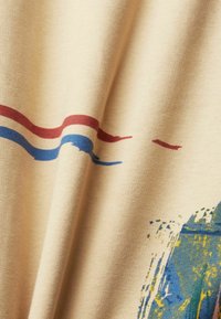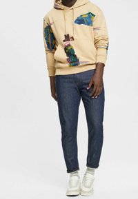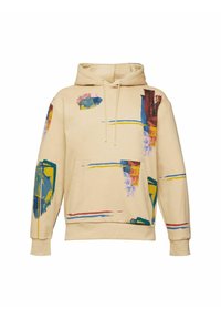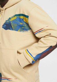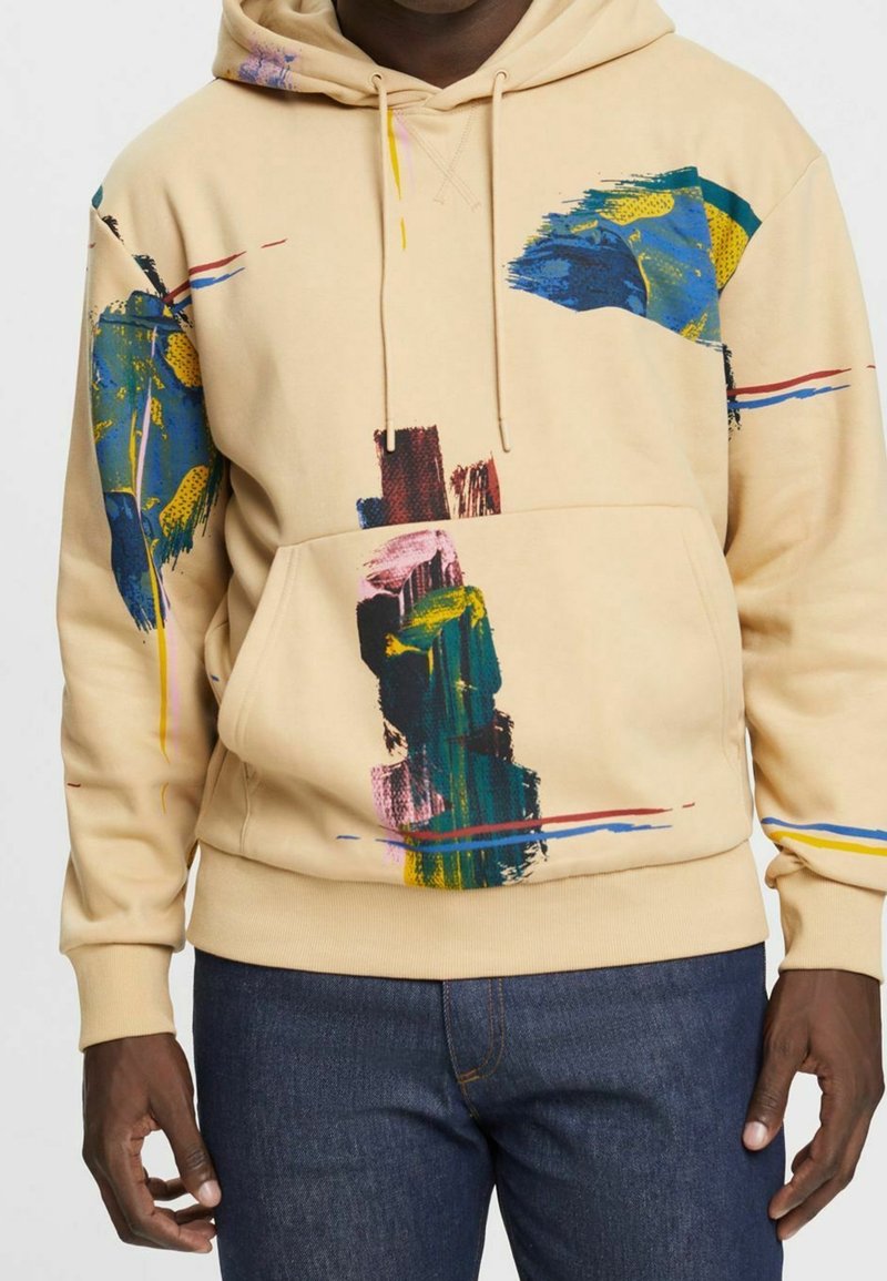 Sweat à capuche beige avec des touches de peinture abstraite colorée en bleu, jaune, vert, rose et rouge, porté avec un jean bleu foncé.