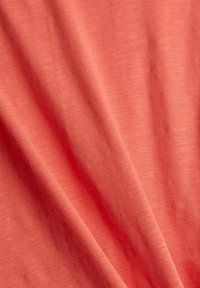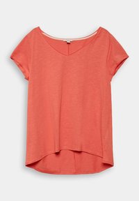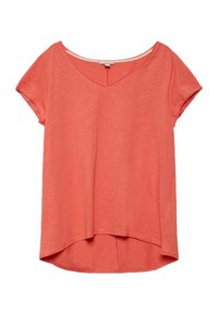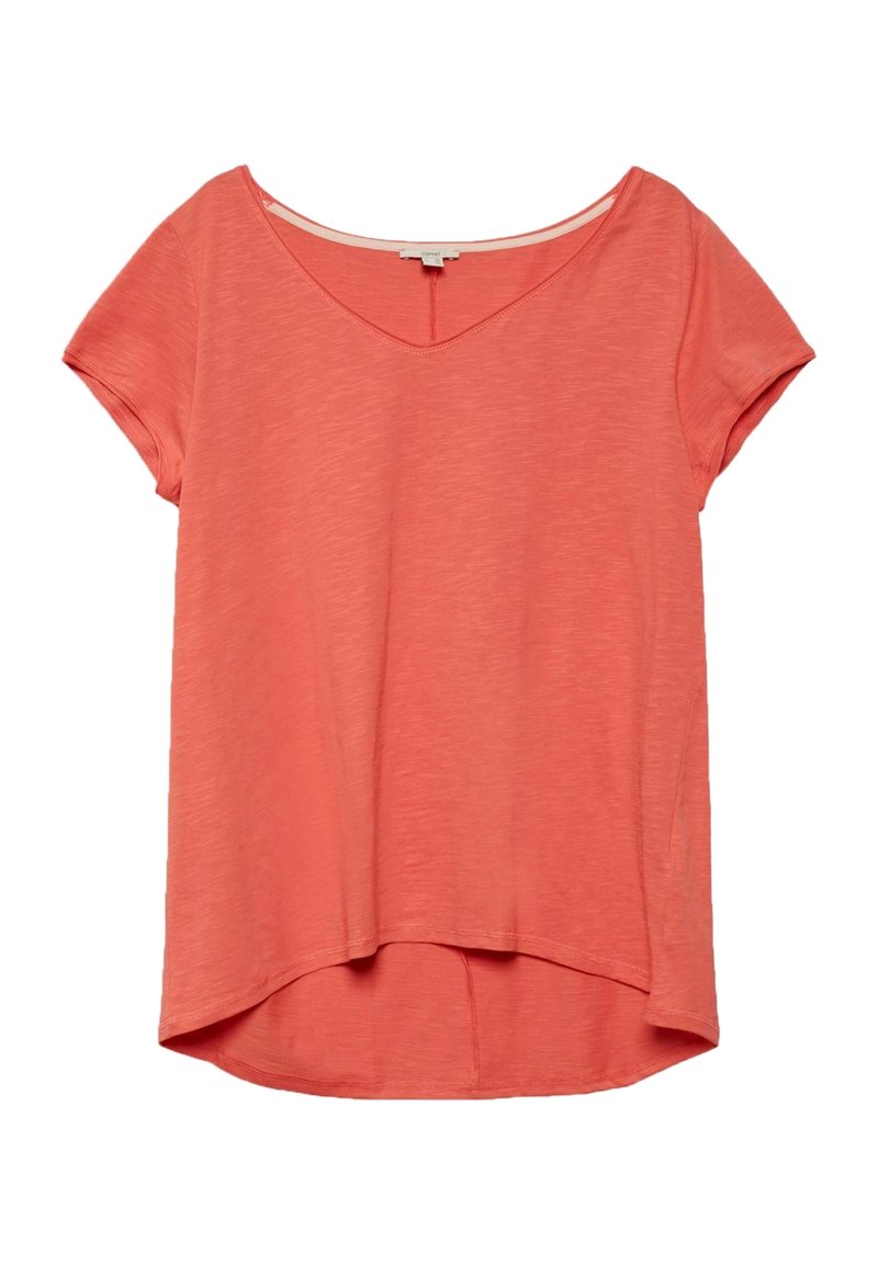 Top pour femme à manches courtes en corail avec col en V et ourlet arrière légèrement plus long, fabriqué en tissu texturé léger.