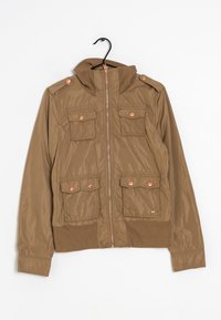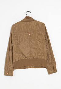 Veste marron clair à fermeture éclair avec quatre poches à rabat boutonnées et col et ourlet côtelés, présentée sur un cintre noir.