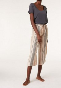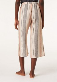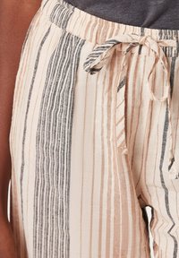 Pantalons courts en crème clair avec des rayures verticales rose et noire. Équipés d'une taille élastique avec cordon de serrage. Tissu léger.