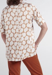 Femme portant une chemise à manches courtes beige et blanche avec un motif abstrait et un pantalon couleur rouille, debout, une main sur la hanche, dos face à la caméra.