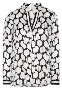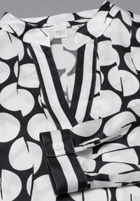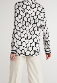 Femme portant un chemisier à manches longues noir et blanc à motifs, associé à un pantalon blanc taille haute à jambes larges, sur un fond uni.