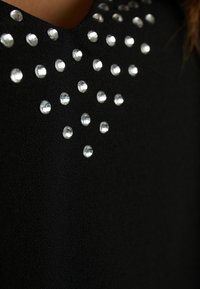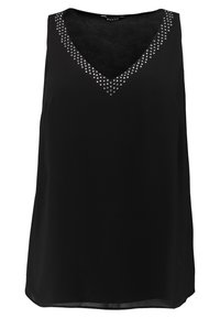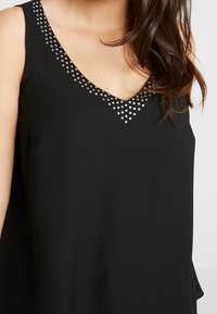 Femme portant un haut noir sans manches avec un col en V orné de clous, les mains légèrement jointes à la taille, debout devant un fond clair uni.