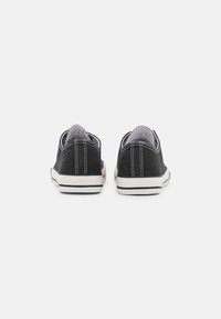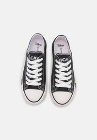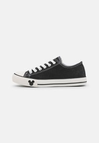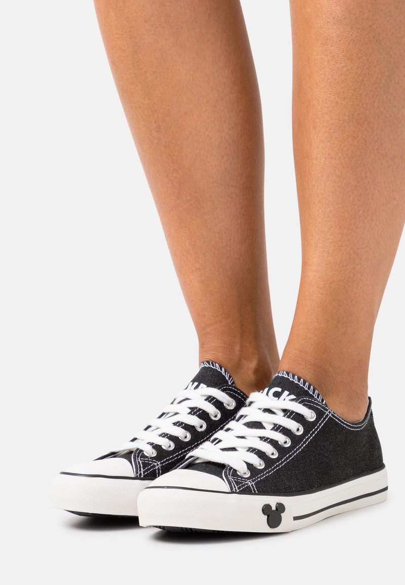 Baskets en toile noire avec des lacets blancs et une semelle blanche, arborant une petite silhouette de Mickey Mouse sur le côté.