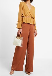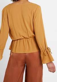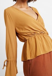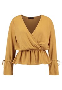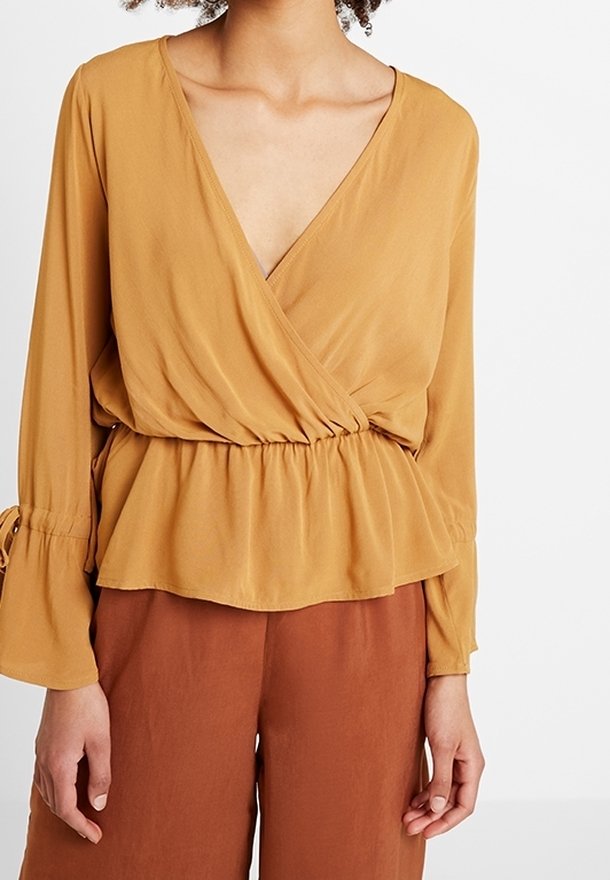 Femme portant un chemisier cache-cœur à col en V jaune moutarde à manches longues et un pantalon couleur rouille sur un fond blanc uni.