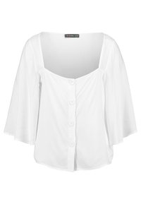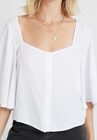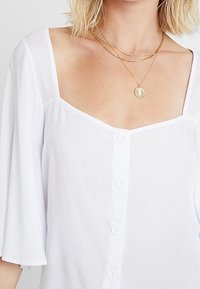 Blouse blanche boutonnée avec encolure carrée et manches courtes amples, associée à des colliers en chaînes dorées superposées et un pantalon sombre.