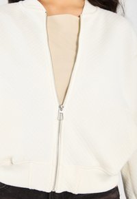Femme portant une veste matelassée blanche à fermeture éclair sur un haut beige et un pantalon noir avec un détail en boucle sur le côté.