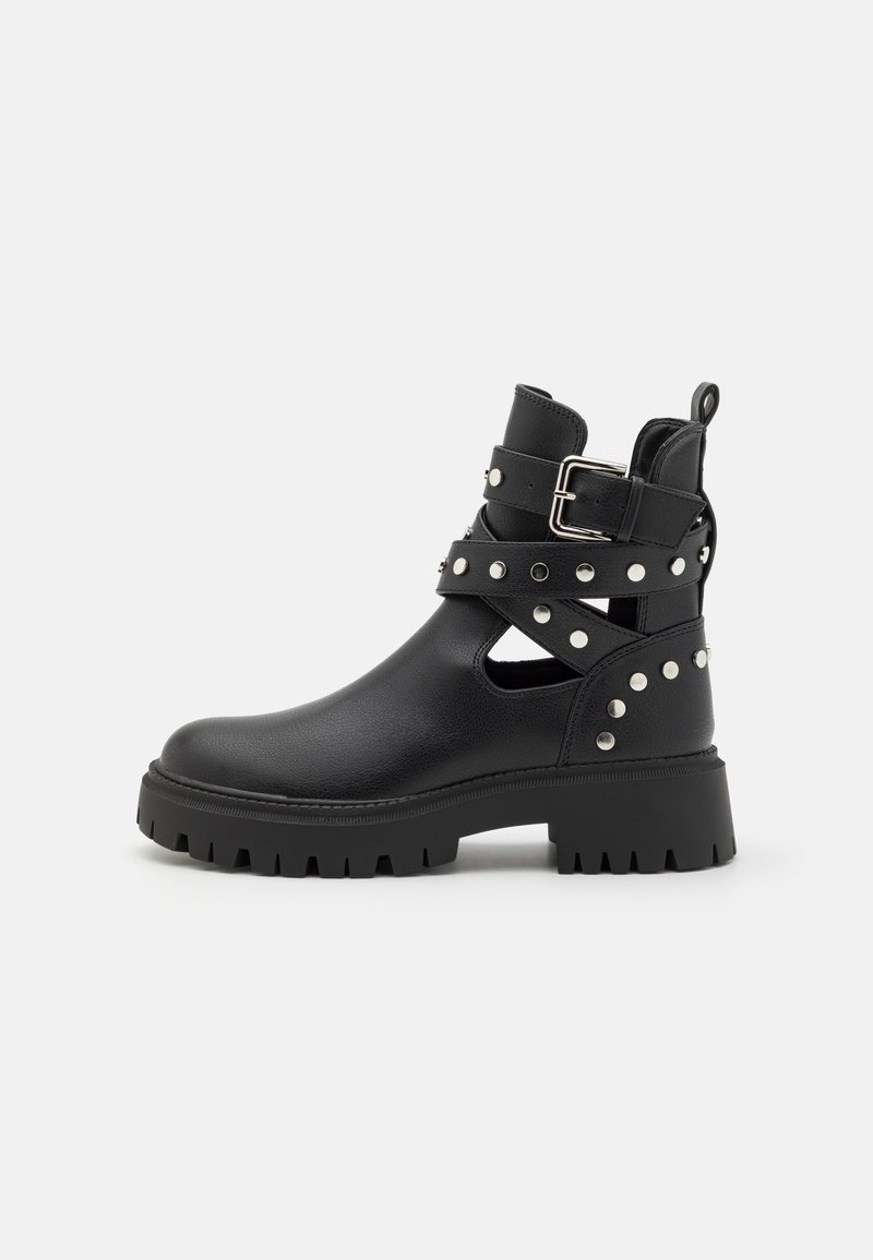 Bottine noire à talon épais, en cuir texturé. Dotée de clous argentés, de sangles à boucle et de sections découpées.