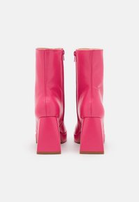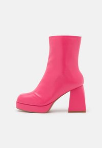 Bottes basses en similicuir rose avec un talon carré épais et une fermeture éclair avant, présentant une finition lisse et brillante ainsi qu'un design minimaliste.