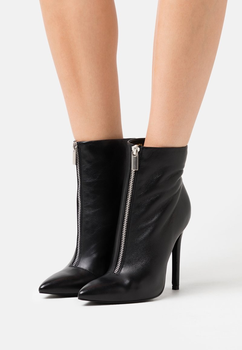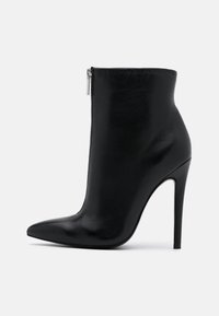 Bottines en cuir noir à bout pointu, avec fermeture éclair argentée et talon stilettos. Texture lisse avec des plis doux au niveau de la cheville.