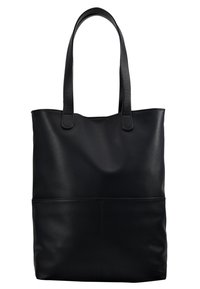 Sac fourre-tout en cuir noir avec deux longues poignées, forme arrondie, texture lisse, et un détail de poche avant. Design minimaliste sans ornements.