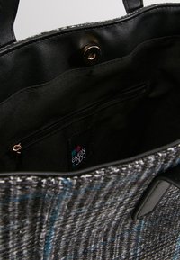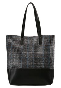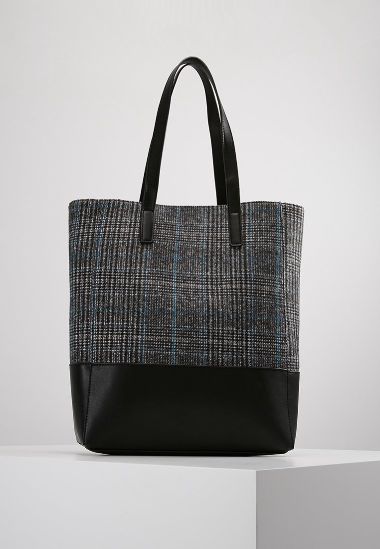 Sac fourre-tout en tissu gris tissé avec un motif à carreaux bleu et noir, complété par une base et des poignées en similicuir noir.