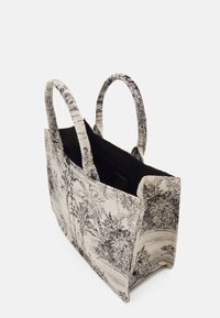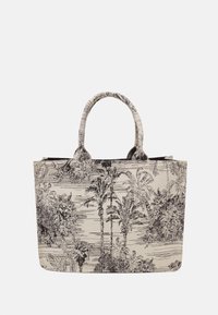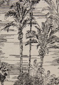 Sac fourre-tout en tissu crème avec un motif de palmier noir. Dispose de poignées courtes à motif et d'une forme rectangulaire. Surface texturée.