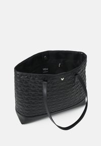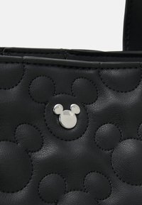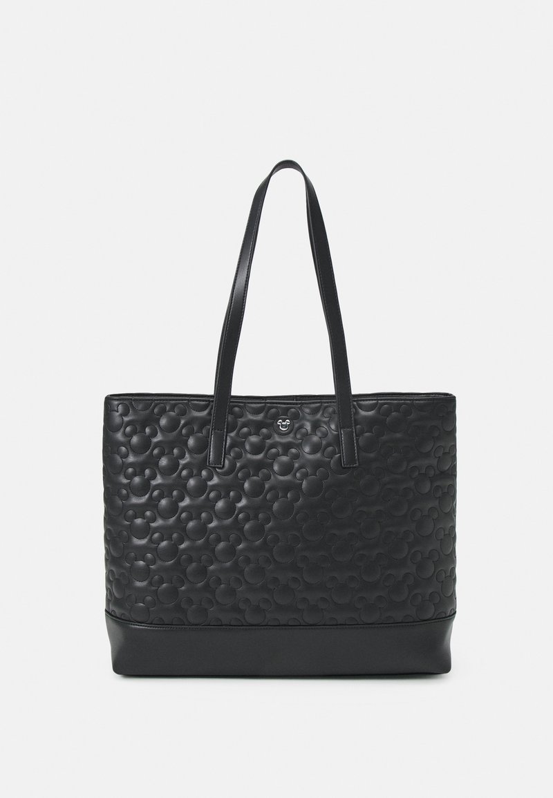 Sac cabas noir avec motifs en relief de tête de Mickey Mouse et deux bretelles, orné d'un petit embellissement argenté en forme de tête de Mickey.