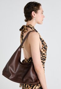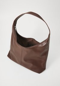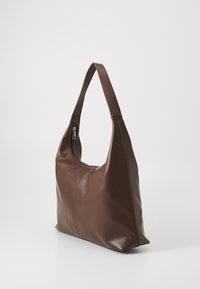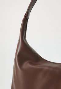 Sac à bandoulière en cuir marron avec une seule sangle et une couture verticale centrale, posé sur un fond clair uni.