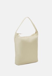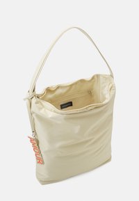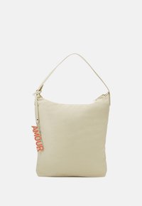 Sac à bandoulière beige avec une texture lisse et douce, équipé d'une fermeture éclair, d'une longue sangle, et d'un accent orange "AMOUR" attaché.