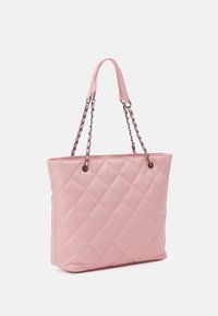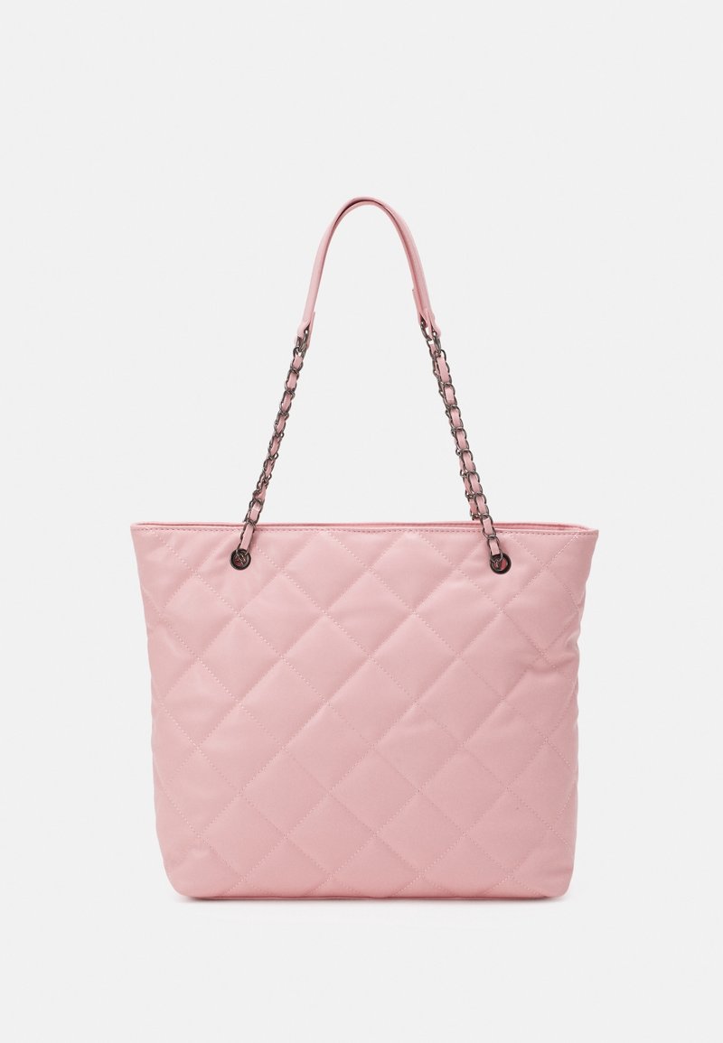 Sac fourre-tout matelassé rose avec poignées doubles en chaîne et tissu, présentant une forme rectangulaire et une texture lisse. Aucun détail de quincaillerie visible.