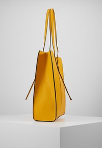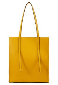 Sac fourre-tout rectangulaire jaune avec deux fines bretelles, finition lisse et bordure noire, posé debout sur une surface blanche.