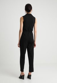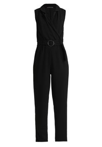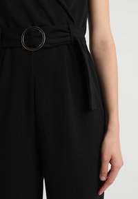 Combinaison noire sans manches avec un col en V et une ceinture à la taille. Fabriquée en tissu lisse, avec des plis et une silhouette cintrée.