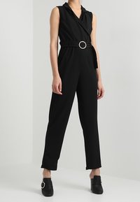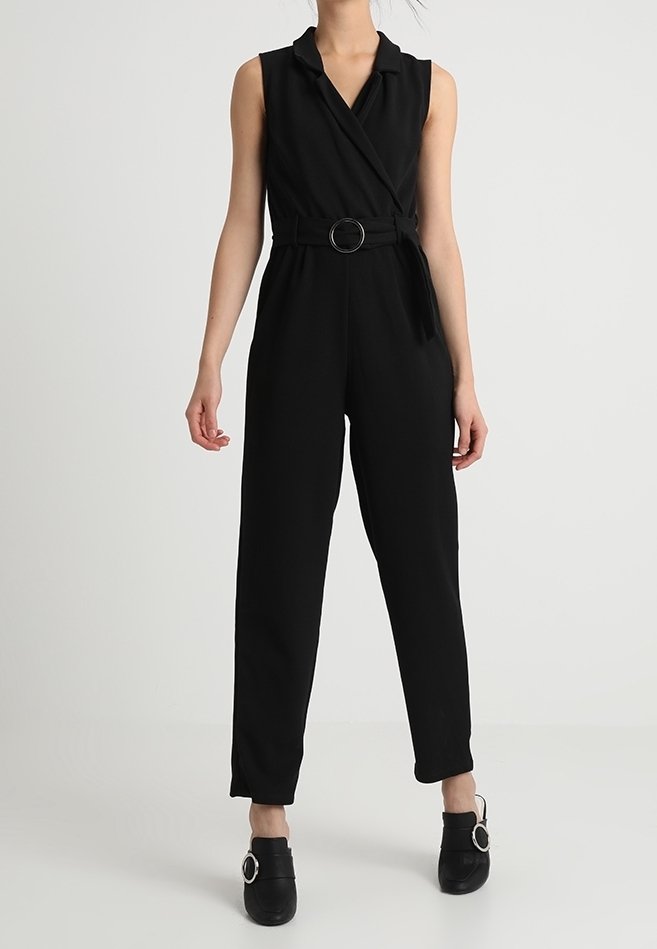 Femme portant une combinaison noire sans manches ceinturée avec un col large et des chaussures noires ornées d'une boucle circulaire.