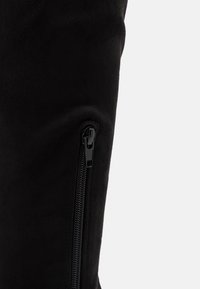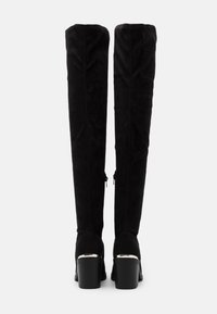 Bottes cuissardes en daim noir avec talons carrés, portées sur des jambes nues, présentées sur un fond blanc uni.