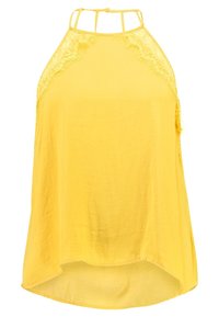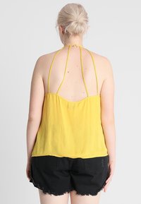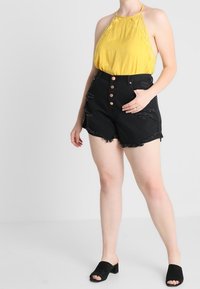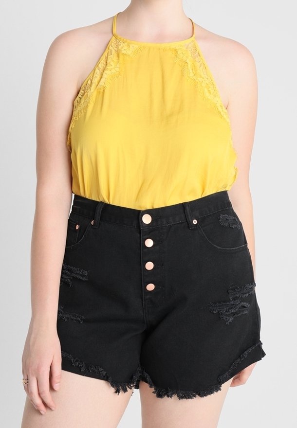Femme portant un haut jaune sans manches à col licou avec des détails en dentelle, associé à un short en denim noir déchiré taille haute avec fermeture à boutons.