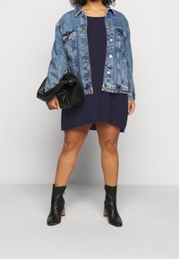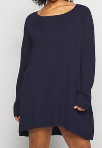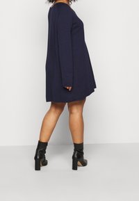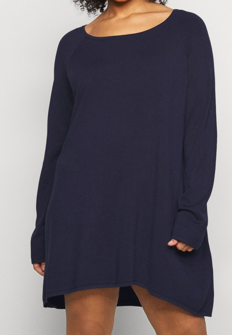 Femme portant une robe bleu marine à manches longues, ample, avec un décolleté arrondi, debout devant un fond clair uni.