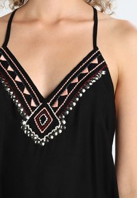 Femme portant un haut sans manches noir avec de fines bretelles, présentant un col en V avec des broderies géométriques roses et argentées, associé à un jean bleu.