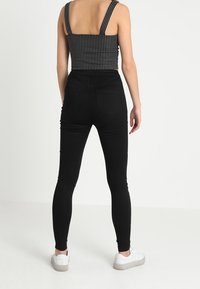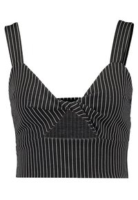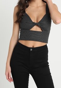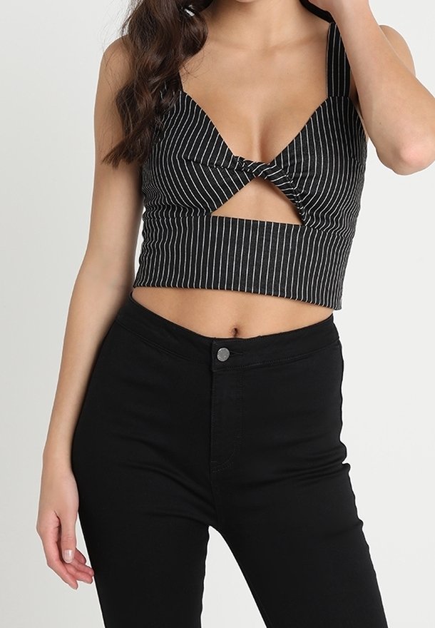 Crop top rayé noir et blanc avec un design torsadé sur le devant et des bretelles larges, associé à un jean noir taille haute. Texture de tissu lisse.