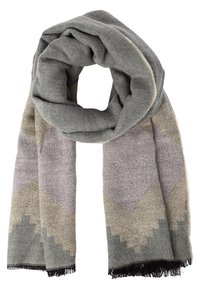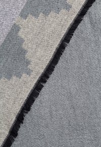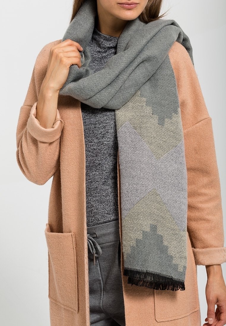 Femme portant un manteau beige, un pull gris et une écharpe grise à motifs enroulée autour du cou, tenant l'écharpe d'une main.