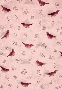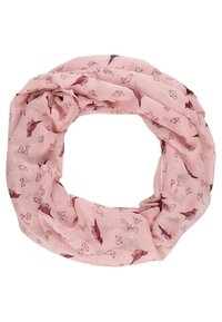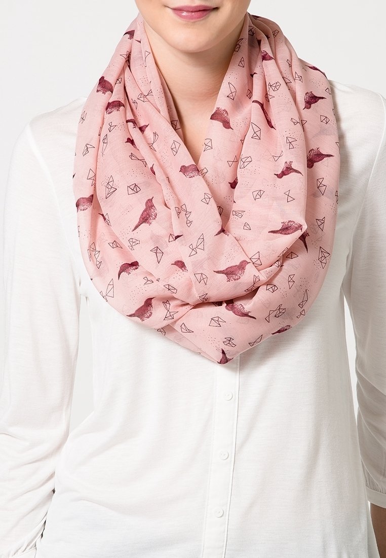 Femme portant une écharpe infinity rose clair avec des motifs d'oiseaux rouges et géométriques sur une chemise blanche boutonnée.