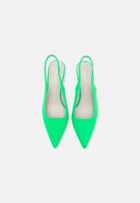 Escarpins verts à bride arrière avec un bout pointu, fabriqués en matériau lisse, dotés d'un petit talon et d'un design minimaliste sans motifs visibles.