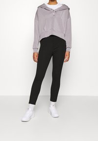 Leggings noirs à coupe slim, en matière extensible, associés à un sweat large gris clair et des baskets blanches.