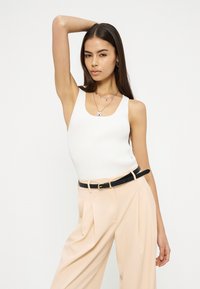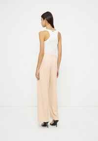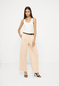 Femme portant un pantalon beige plissé à jambes larges avec une ceinture noire et des sandales à talons ouvertes noires, debout sur un fond blanc.