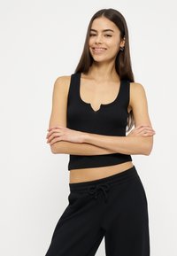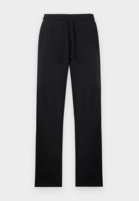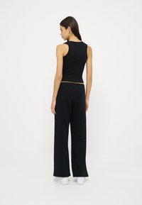 Femme portant un pantalon noir à jambes larges avec taille à cordon et des baskets blanches, debout devant un fond blanc uni.