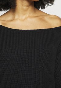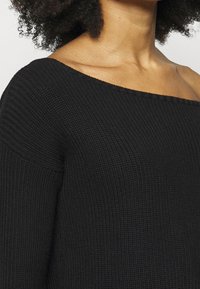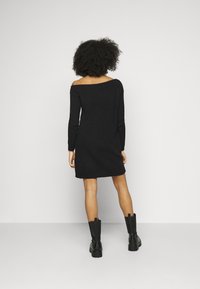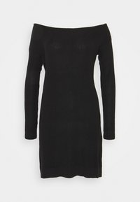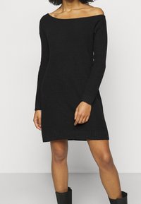 Femme portant une robe en maille noire à manches longues décolleté épaules nues et des bottines noires, debout devant un fond clair uni.